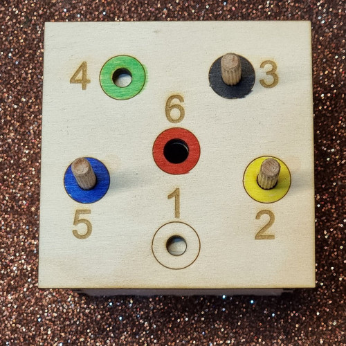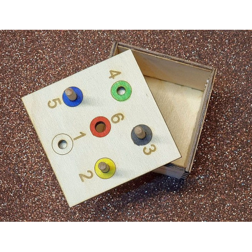 Holzbox in die Mitte des Tisches stellen. Alle Holzstäbe an die Mitspielenden verteilen. Je nach Alter der Kinder den Farb- oder Zahlenwürfel wählen. Das erste Kind würfelt. Ein Hölzchen wird in die entsprechende farbmarkierte/nummerierte Bohrung im Deckel gesteckt. Der Nächste ist an der Reihe. Wird eine Farbe oder Zahl gewürfelt, die bereits belegt ist, so muss das Hölzchen, das im Deckel steckt, genommen werden. Würfelt man eine 6/rot, wird das Stäbchen in die Box geworfen. Danach darf noch einmal gewürfelt werden. Gewonnen hat, wer als Erstes alle Stäbe in die Box gesteckt hat.