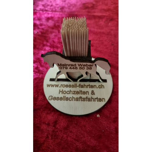 Zahnstocher Halterung mit Pferd für Werbezwecke und als Dankeschön. Pappelnsperrholz 4 mm. Ein einmaliges Geschenk, die Errinnerungen bleiben.